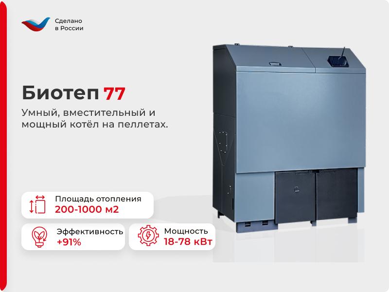 Биотеп 77 – самый вместительный и мощный котел в линейке котлов Биотеп. При способности отапливать до 1100 м2, Биотеп 77 не занимает много места. Применение технологии FIRE CONTROL обеспечивает пользователям целый ряд преимуществ. Позволяя котлу приспосабливаться к меняющимся условиям эксплуатации, FIRE CONTROL представляет собой шаг к большей эффективности, экономии расходов, сокращению выбросов для защиты окружающей среды. Котел оснащен группой безопасности, автоматика позволяет запускать котел без предварительной настройки под пеллеты или конструкцию дымохода. Котлы можно подключать в каскаде, увеличивая максимальную мощность в котельной. Основные преимущества Саморегуляция мощности от 18 до 77 кВт Автоматический старт/стоп (авторозжиг) Распознавание теплотворности пеллет Распознавание конструкции дымохода Встроенный бункер для пеллет на 280 л Запуск и калибровка без участия специалиста Автоматическая очистка во время работы Подготовка горячей воды Производство в России Доставка в стоимость не включена